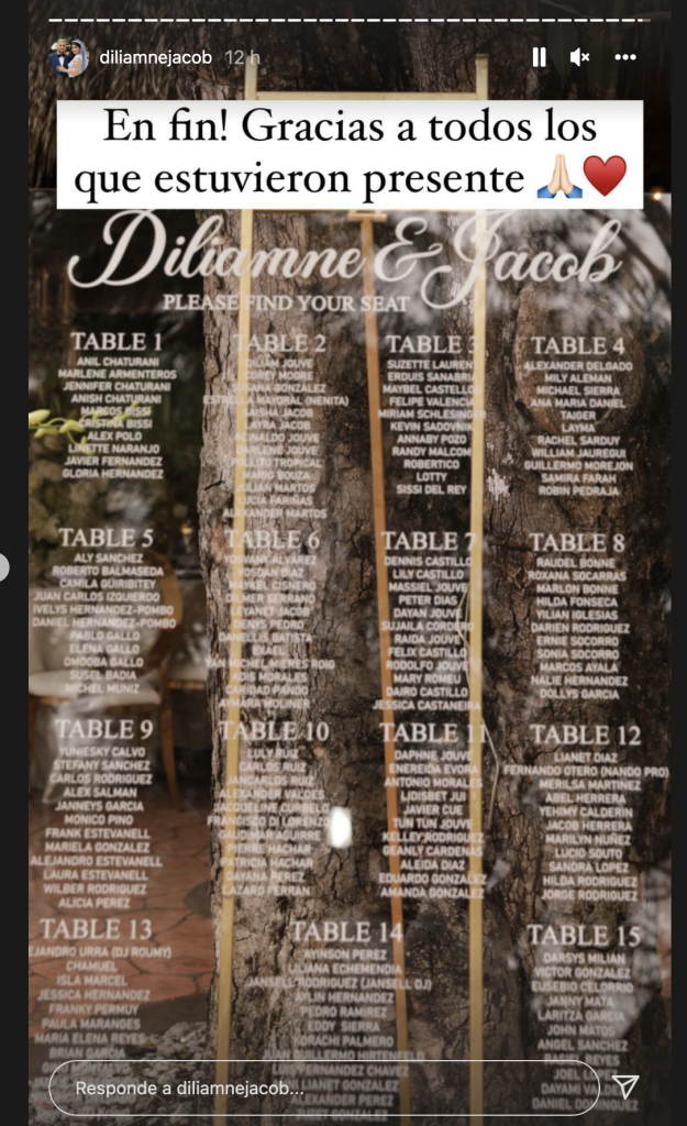 La pareja de famosos sí fue invitada a la boda. Una publicación en las historias en Instagram de La Dura mostró lo que parece ser la distribución por mesas de los asistentes a la boda, a quienes la novia agradeció por compartir con ella y Jacob ese momento.