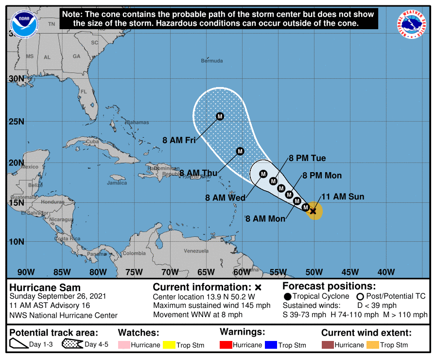 Durante el día de hoy el huracán Sam continuó fortaleciéndose rápidamente, para convertirse en el cuarto huracán de gran intensidad de la actual temporada ciclónica. Tiene vientos máximos sostenidos de 220 kilómetros por hora, con rachas superiores y una presión mínima de 943 hectoPascal, por lo que es un huracán categoría cuatro en la escala Saffir-Simpson, de un máximo de cinco. Se desplaza con rumbo próximo al oeste-noroeste a razón de 17 kilómetros por hora.