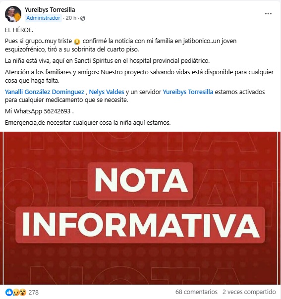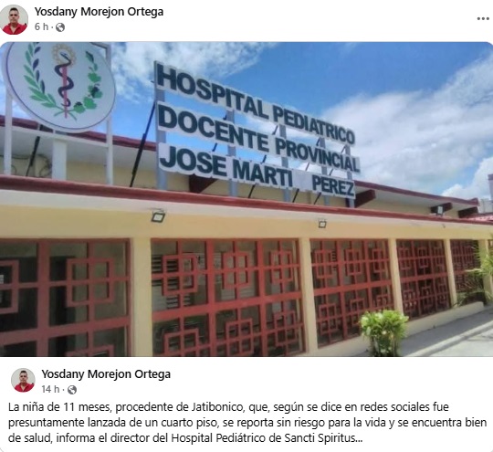 La niña, identificada como Nathaly, sobrevivió milagrosamente a la caída y fue trasladada de inmediato al Hospital Provincial Pediátrico de Sancti Spíritus, donde los médicos la atienden. Aunque se informa que está fuera de peligro, continúa bajo estricta vigilancia en la unidad de cuidados intensivos.