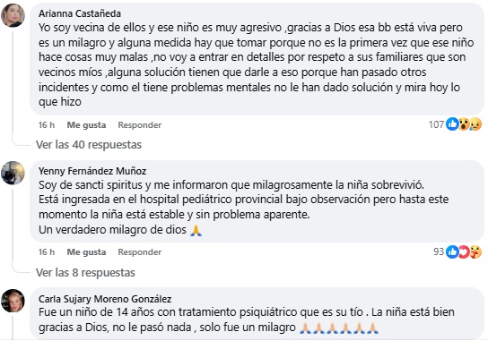 “Yo soy vecina de ellos y ese niño es muy agresivo. Gracias a Dios que esa bebé está viva, pero es un milagro, y alguna medida hay que tomar, porque no es la primera vez que ese niño hace cosas muy malas”, indicó una supuesta vecina de la familia.