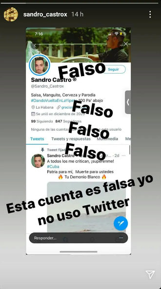 “Esa cuenta es Falsa. Yo no uso Twitter”, se lee en una historia de Instagram publicada por Sandro y que su novia, Laura Daniela Álvarez Torres, replicó.