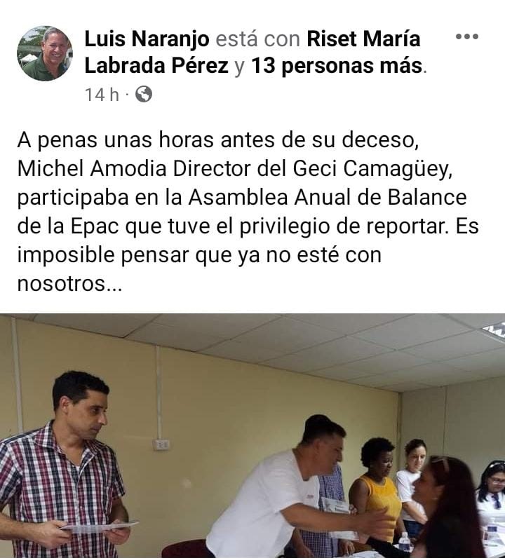“Falleció en la tarde de este martes Michel Amodia Ferrer, director del Grupo Empresarial de Comercio Camagüey. Sus compañeros de trabajos y amigos han compartido sus impresiones sobre Amodia, reconociendo su compromiso y entrega en la labor diaria en el sector del Comercio, su responsabilidad, consagración, y sentido de pertenencia. A sus familiares, amigos y compañeros de trabajo las más sentidas condolencias. Información en construcción”, indicó el medio Adelante, el cual señaló que expediría la noticia, pero no volvió a pronunciarse sobre el tema.