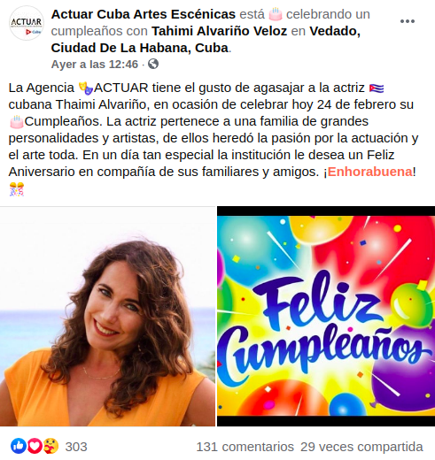 “La Agencia ACTUAR tiene el gusto de agasajar a la actriz cubana Thaimi Alvariño, en ocasión de celebrar hoy 24 de febrero su Cumpleaños. La actriz pertenece a una familia de grandes personalidades y artistas, de ellos heredó la pasión por la actuación y el arte toda. En un día tan especial la institución le desea un Feliz Aniversario en compañía de sus familiares y amigos. ¡Enhorabuena!”, escribió la agencia en su muro de Facebook.