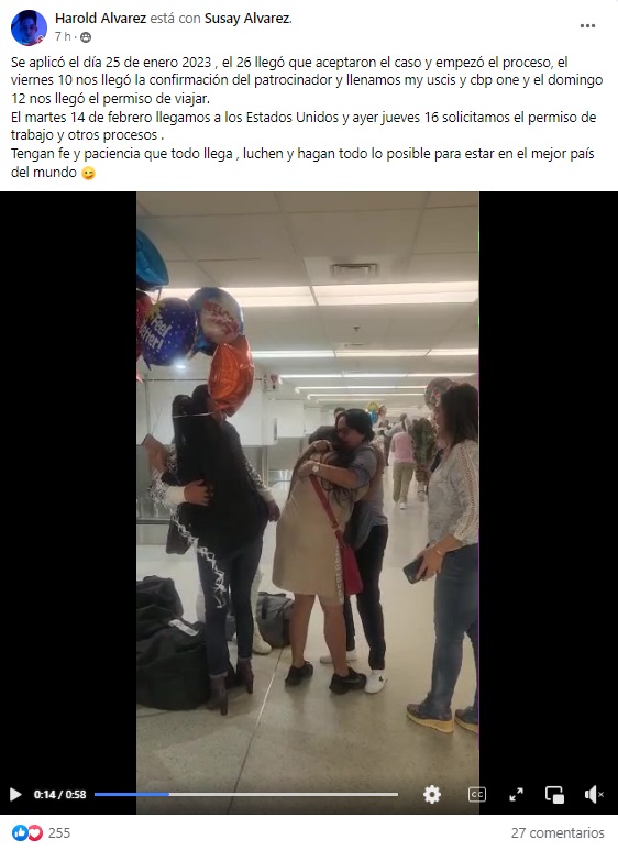 “Se aplicó el día 25 de enero 2023, el 26 llegó que aceptaron el caso y empezó el proceso. El viernes 10 de febrero nos llegó la confirmación del patrocinador, y llenamos Myuscis y CBP One y el domingo 12 nos llegó el permiso de viajar”, inicia la publicación.