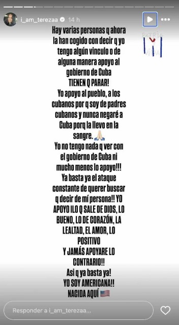 “Apoyo al pueblo, a los cubanos, porque soy hija de padres cubanos y jamás renegaré de Cuba, ya que llevo su esencia en mi sangre. Pero no tengo ningún vínculo con el gobierno de Cuba ni respaldo sus acciones de ninguna manera”, subrayó con firmeza.