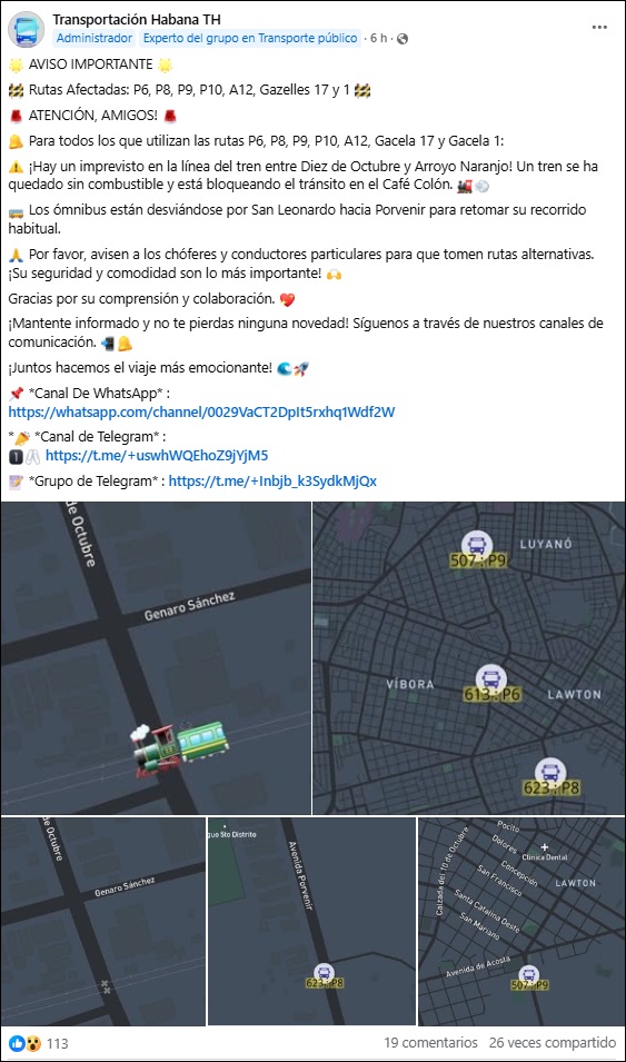 La información fue difundida por el perfil de Facebook “Transportación Habana TH”, que alertó sobre la inesperada situación y sus consecuencias en la movilidad urbana.