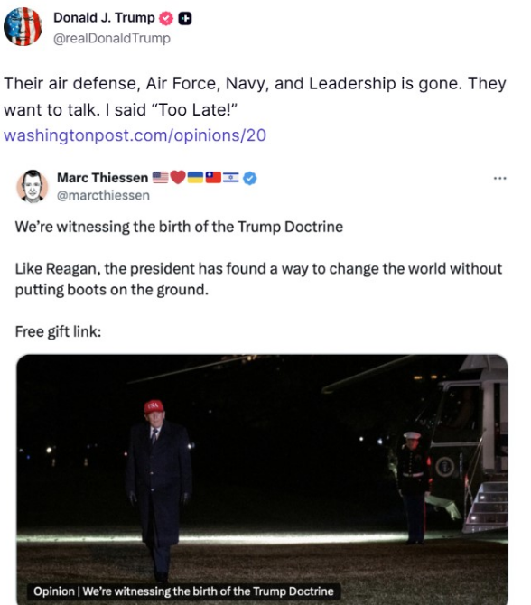 El pronunciamiento coincidió con la difusión de un artículo de opinión favorable a la operación militar publicado en The Washington Post, que el propio Trump compartió para reforzar su argumento de que la campaña ha debilitado de forma decisiva al régimen iraní.