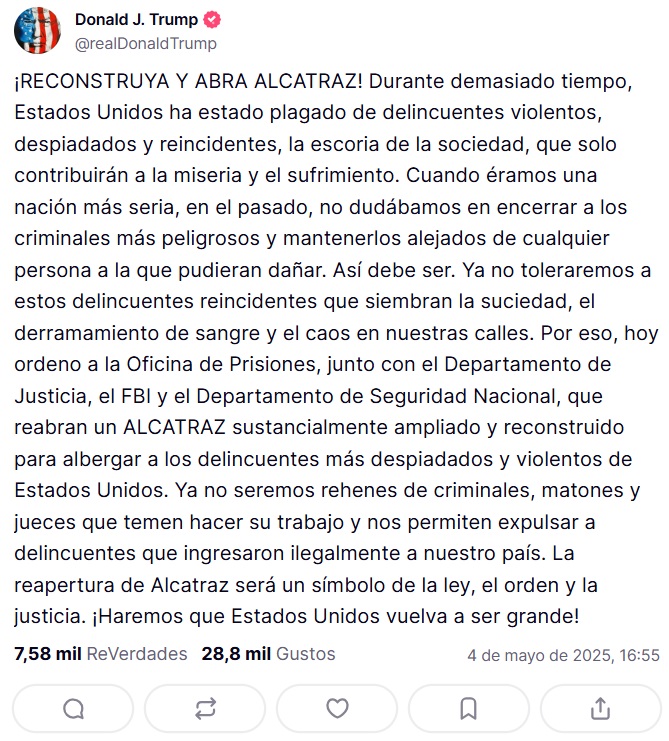 “¡Reconstruyan y reabran Alcatraz! Durante demasiado tiempo, Estados Unidos ha sido un refugio para delincuentes crueles y reincidentes que jamás aportarán nada positivo, solo miseria y sufrimiento”, escribió Trump en su publicación.