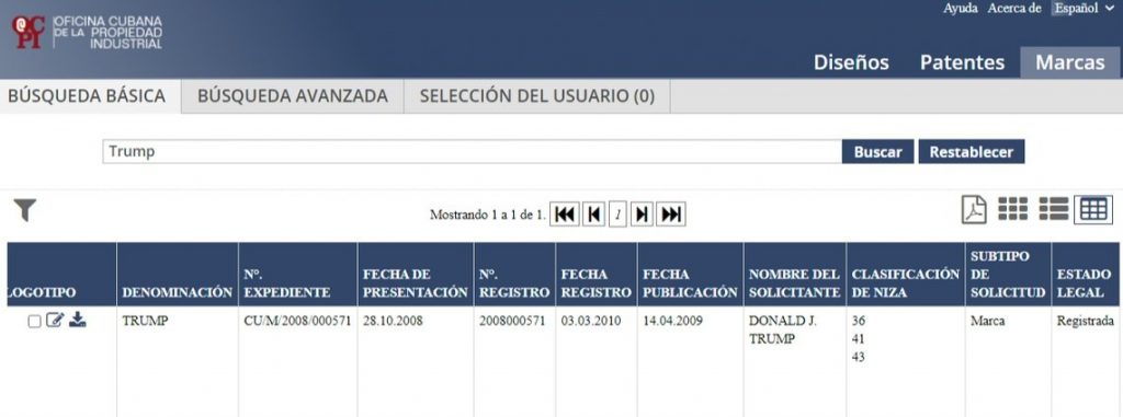 (Captura de pantalla del sitio web de la Oficina de Propiedad Industrial de Cuba que muestra detalles de la marca Trump registrada en Cuba Foto: Miami Herald)