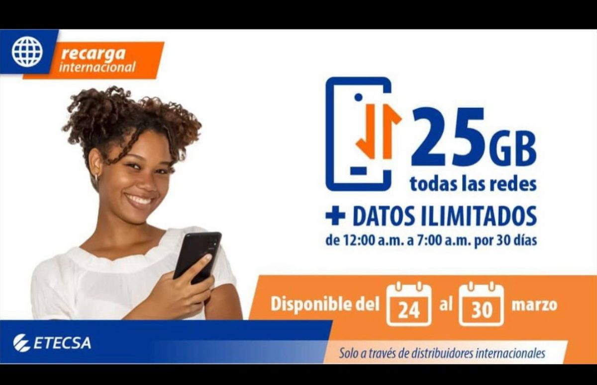 “¡Se acerca una nueva promo! Marzo continúa con ofertas especiales: pronto podrás obtener 25GB + datos ilimitados de 12:00 a.m. a 7:00 a.m., con la recarga internacional del 24 al 30 de marzo. Mantente atento y conoce toda la info en www.etecsa.cu”, se lee en el comunicado de la empresa estatal.
