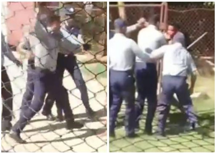 Él intenta defenderse, pero los oficiales, como si no fuesen suficientes los golpes con las manos, usan un baston para darle en las piernas y los brazos.