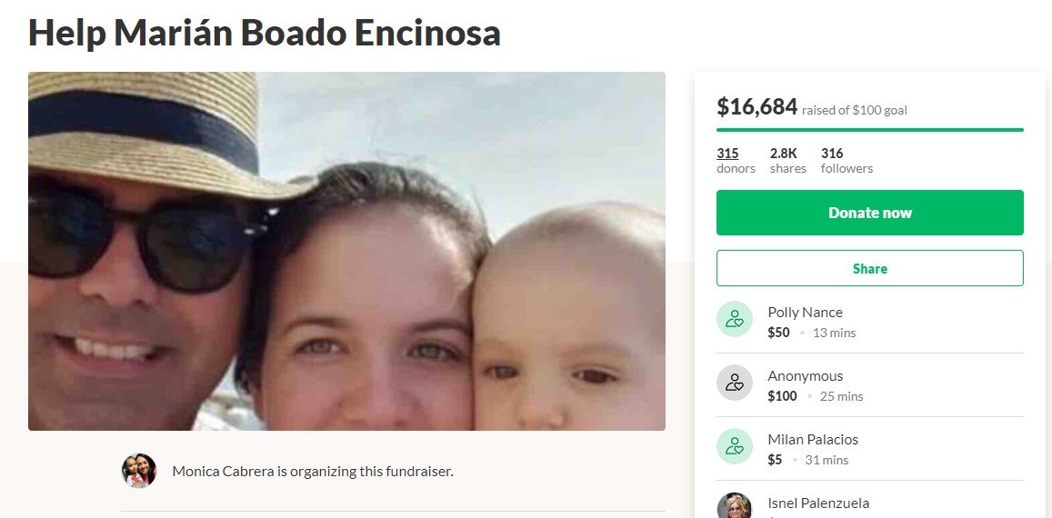 Con el propósito de recaudar fondos para cubrir los gastos de posibles intervenciones quirúrgicas y demás cuidados, una amiga de la víctima que se llama Mónica Cabrera tuvo la iniciativa de crear una campaña en GoFundMe para que todos aquellos que se quieran solidarizar con ella, pueda contribuir por allí.