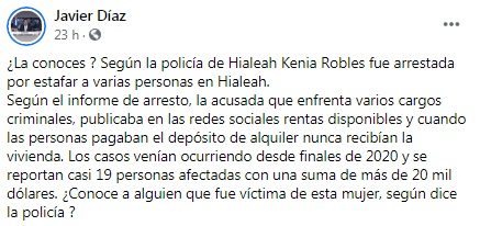 El reporte de la policía reveló que Robles utilizaba un esquema de engaños por medio de redes sociales para realizar la estafa de renta de viviendas en Hialeah. Las actividades fueron de gran magnitud y se desarrollaron entre octubre del 2020 hasta mayo del presente 2021.