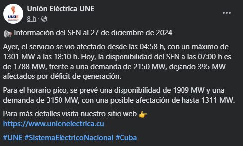 Para este viernes 27 de diciembre, la empresa estatal Unión Eléctrica (UNE) de Cuba pronosticó severos apagones debido al déficit de generación, con una afectación máxima de 1.311 MW.