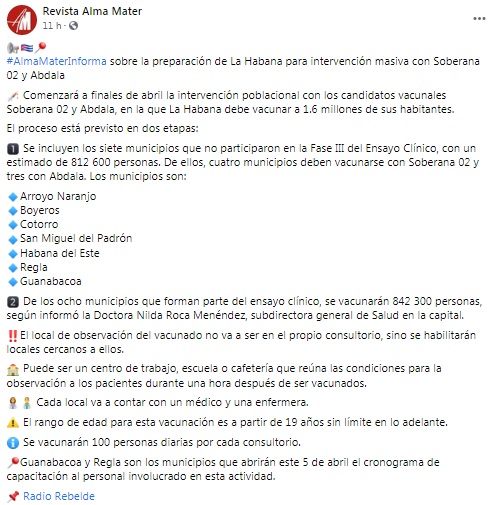 A través del perfil de Facebook de la revista universitaria Alma Mater se informó que el proceso de inmunización será a partir de los 19 años, en dos etapas. “En la que La Habana debe vacunar a 1.6 millones de sus habitantes”.