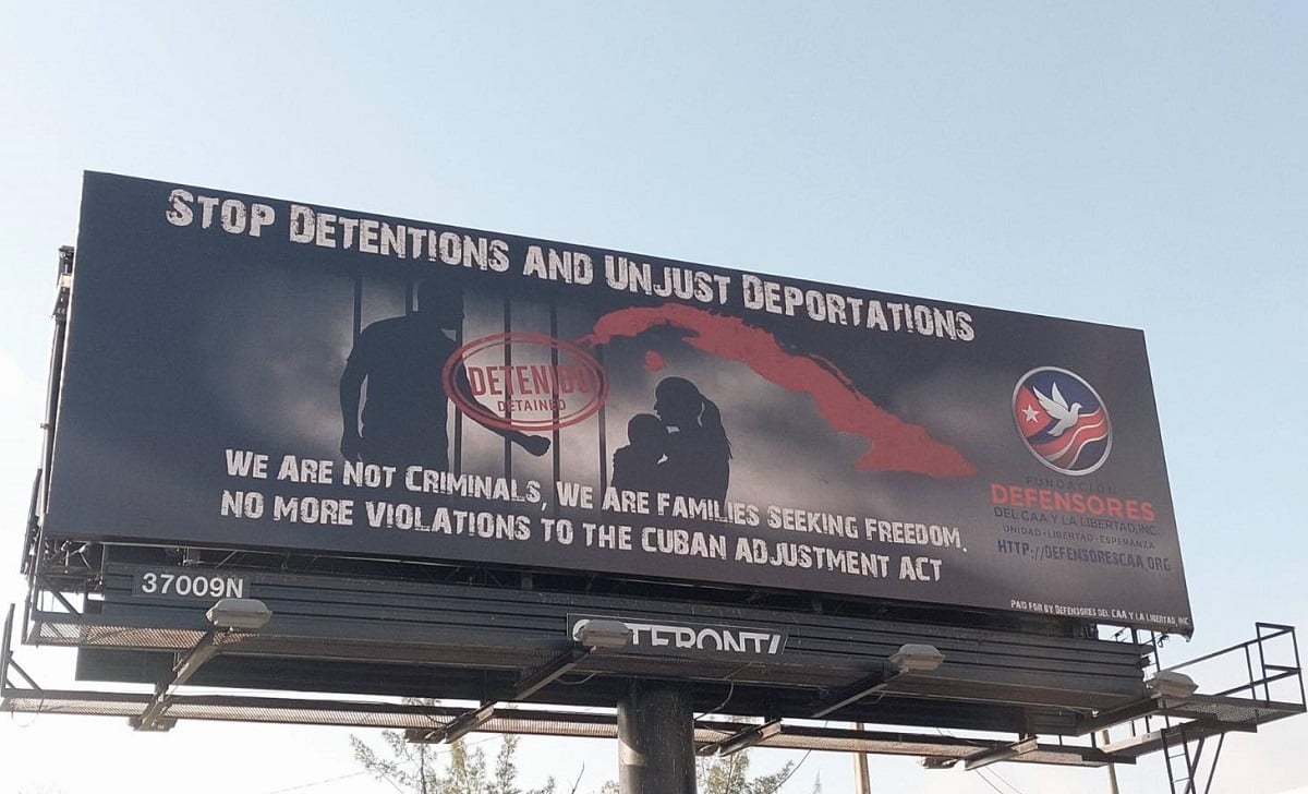 El mensaje de la valla, que forma parte de una campaña de protesta, exige el fin de las detenciones y deportaciones de migrantes cubanos, así como el respeto a la Ley de Ajuste Cubano.
