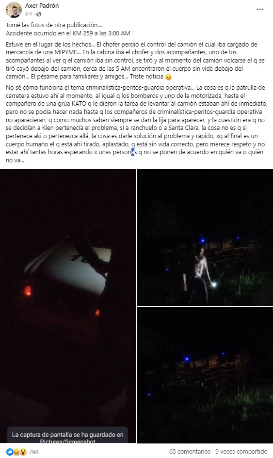 “No sé cómo funciona el tema criminalística-peritos-guardia operativa. La patrulla de carretera estuvo ahí al momento, al igual los bomberos y un agente de la motorizada, hasta el compañero de una grúa KATO, que le dieron la tarea de levantar al camión, pero no se podía hacer nada hasta que los compañeros de criminalística llegaran a hacer su trabajo, no sé a quién pertenecía esta labor, si a las autoridades de Ranchuelo o Santa Clara”, escribió Padrón, quien fue testigo de primera mano.