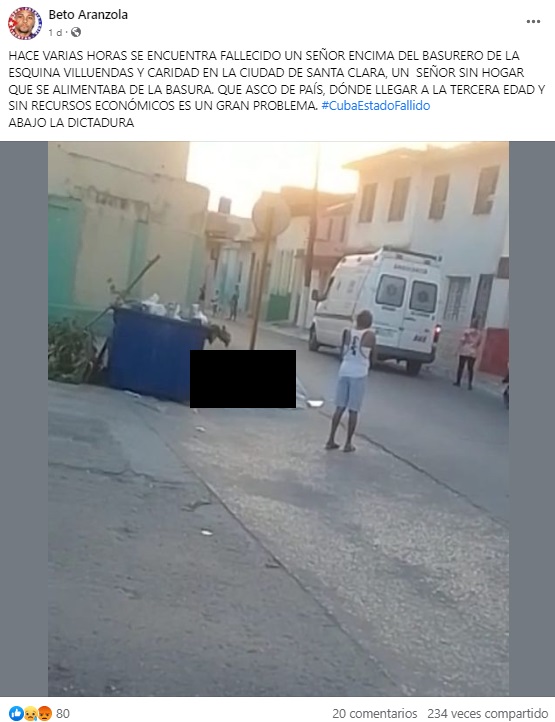 “El señor se alimentaba de la basura, es un asco este país, donde llegar a la tercera edad y sin recursos económicos es un gran problema, ¡Abajo la dictadura!”, agregó el usuario, quien se mostró abiertamente en contra del régimen, al cual calificó como un Estado fallido.