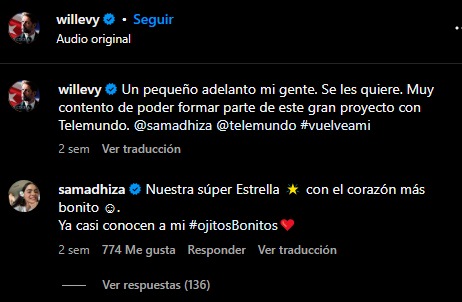 Por ahora, otra de las cosas que ha llamado la atención respecto a la novela, ha sido el supuesto romance que se ha desatado entre Levy y su coprotagonista 15 años menor. Samadhi de 28 años y William de 42 se han acercado mucho durante las grabaciones y la joven incluso lo llama “ojos bonitos”, un apodo que repite en cada publicación que le comenta.