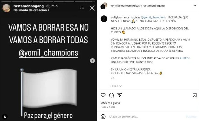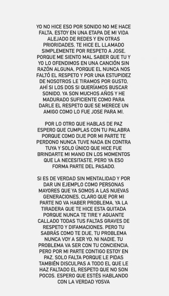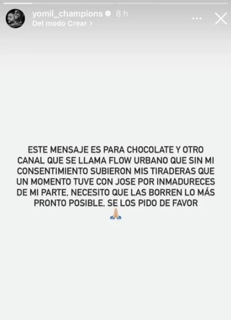 “Este mensaje es para Chocolate y otro canal que se llama Flow Urbano, que sin mi consentimiento subieron las tiraderas que en un momento tuve con José por inmadureces de mi parte. Necesito que las borren lo más pronto posible, se los pido de favor”, escribió Yomil.