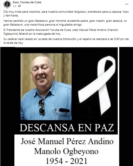 “El Presidente de nuestra Asociación Yoruba de Cuba, José Manuel Pérez Andino (Manolo Ogbeyono) falleció en la madrugada de hoy”, informa la asociación.