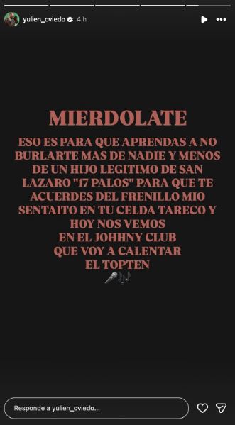 En el mensaje, Oviedo utilizó un tono provocador y burlón para dirigirse a Chocolate MC, haciendo alusión tanto a su permanencia en prisión como a supuestas condenas que podría enfrentar.